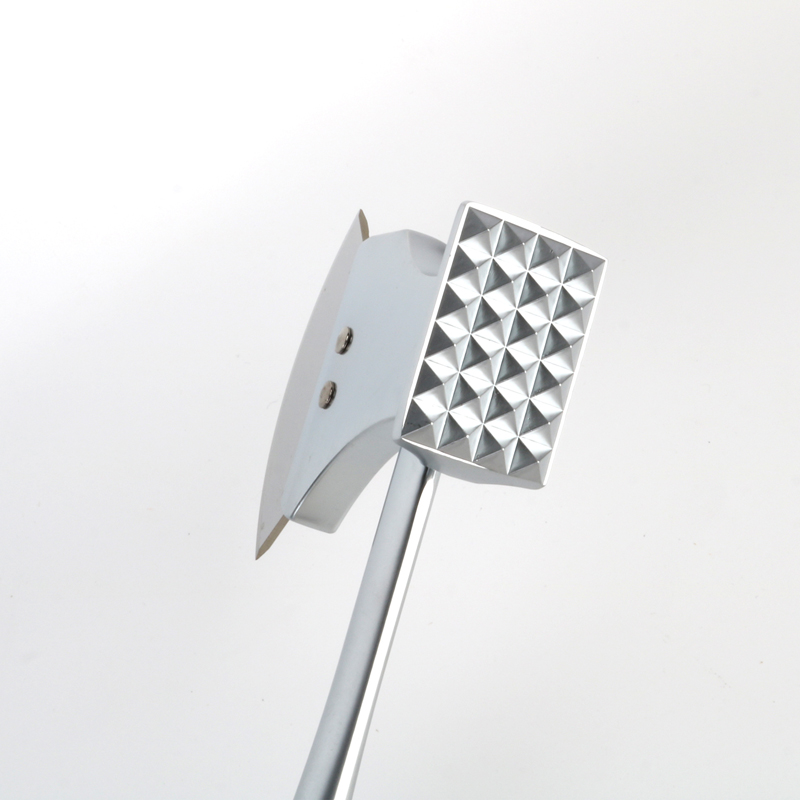 Ang all-in-one na tool na parehong nagsisilbing bagong disenyo ng zinc alloy meat tenderizer at pizza cutter, ay may haba na 25 cm. Ang front end ay nahahati sa dalawang functional surface: isa para sa meat tenderizer at ang isa para sa pizza cutter. Ang handle ay dinisenyo na may na-optimize na hugis ng arko at ang bahagi ng handle na malapit sa grip ay mas makapal para sa isang kamay na nakadikit na mahigpit na nakadikit sa isang kamay ng ABS. ng hawakan upang mabawasan ang pananakit ng palad at dagdagan ang ginhawa sa panahon ng matagal na paggamit.