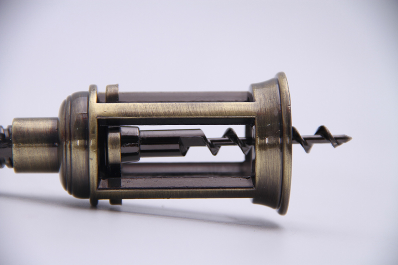 Nag-aalok ang wine opener na ito ng kakaibang pag-alis mula sa mga tradisyonal na disenyo, na nagtatampok ng dalawang natatanging elemento: ang antigong brass patina finish nito at ang spiral-shaped cork-pulling mechanism.