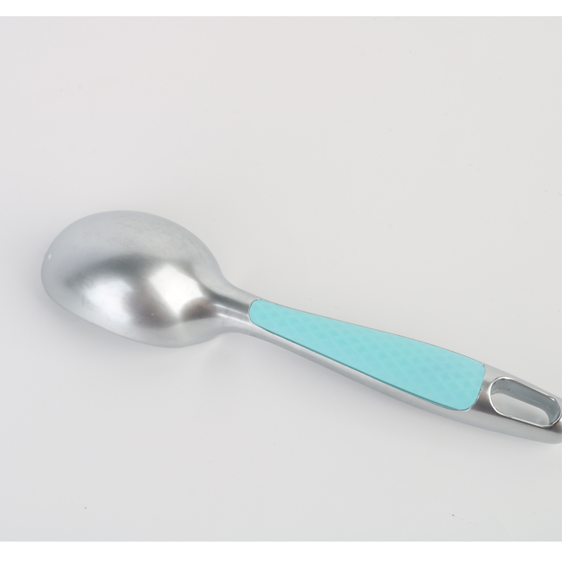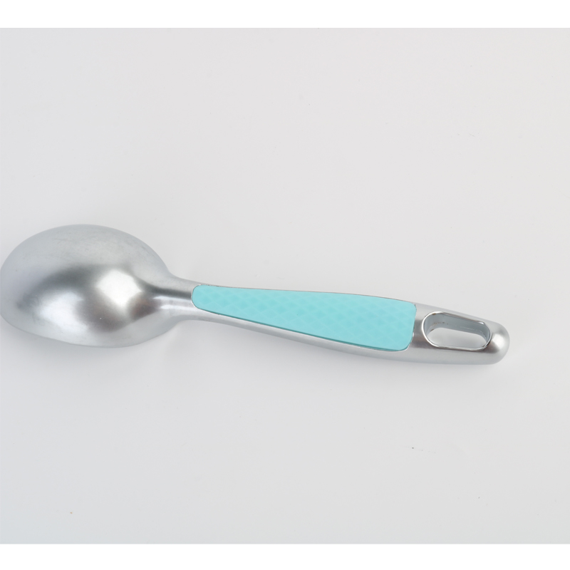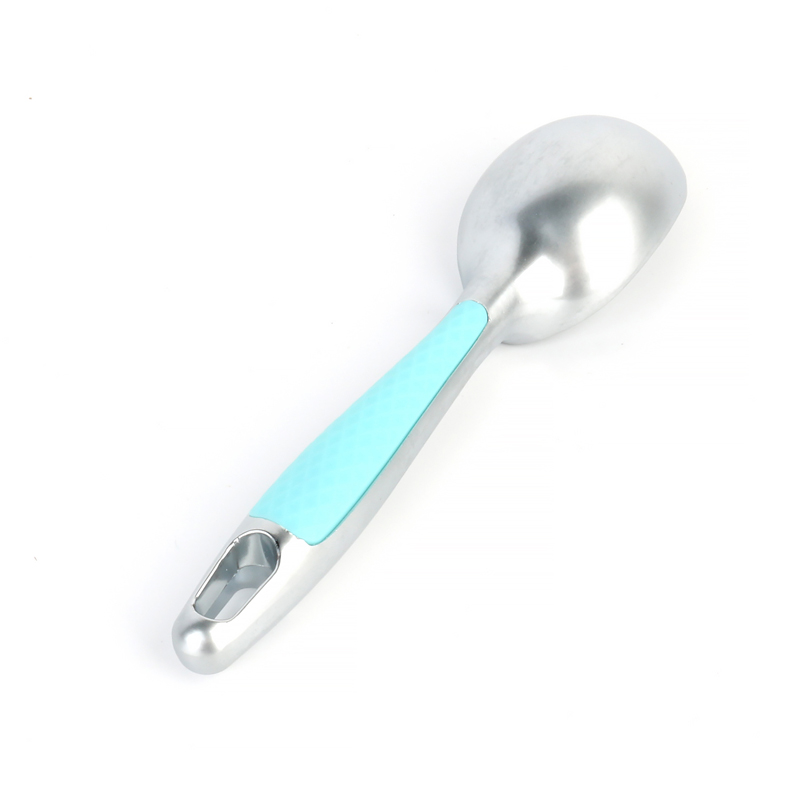 Ang propesyonal na zinc alloy na ice cream scoop na may kumportableng grip dishwasher safe unique cushioned, non-slip plastic handle ay matatagpuan sa reverse side ng produkto, partikular na idinisenyo para sa pinakamainam na grip kapag ginagamit ang four-finger reverse grip. Gaya ng ipinapakita sa mga ilustrasyon ng produkto, ang handle ay may kasamang texture na pattern sa ibabaw na nagsisiguro ng secure na paghawak habang pinapababa nito ang pagkapagod sa pagdidisenyo ng kamay ng user. pagiging praktikal na may eleganteng pagkakayari sa bawat detalye.
